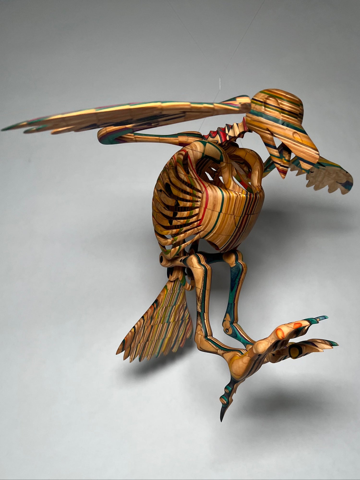 You can see the layered bands of color from the recycled skateboards running through every part of the sculpture. Natural wood tones mixed with bold dyed stripes. Instead of hiding that history, the carving leans into it, letting the contours of the eagle’s body follow those layers. It gives the piece a sense of energy, like the lines themselves are flowing through the wings and down into the talons.